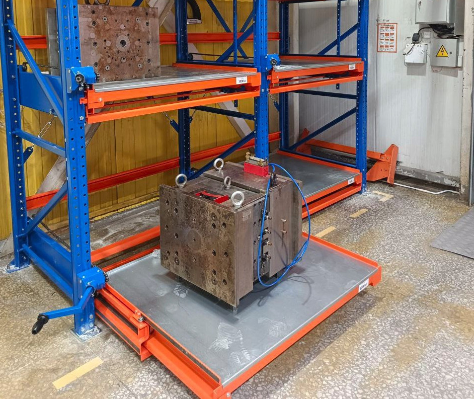 Стеллажи серии Slide оснащены выдвижными полками, каждая из которых выдерживает нагрузку до 1400 кг, что позволяет размещать на них тяжёлые металлические ящики с заготовками, пресс-формами или оснасткой. Такая конструкция обеспечивает безопасное и удобное хранение, а также быстрый доступ к содержимому без использования подъёмной техники.