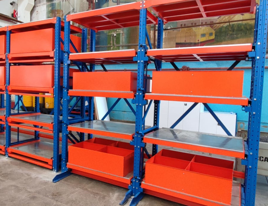 Складские стеллажи с выдвижными полками и лотками